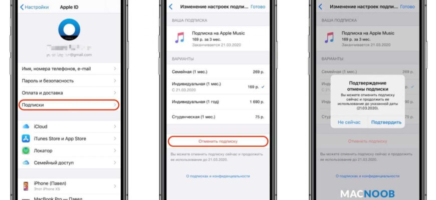 | iPhone | Настройки -> [ваше имя] -> iTunes Store и App Store -> [ваше имя] -> Подписки |