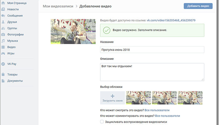 - Нажать кнопку «Отправить» и ждать, пока видео загрузится на вашу страницу или группу в ВКонтакте.