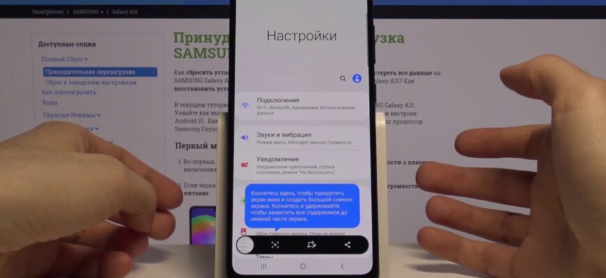 Другой удобный способ создать скриншот — это использовать жесты. В настройках вашего Samsung A31 открываем раздел «Движения и жесты», затем выбираем «Жесты на экране». Включаем опцию «Смахивание ладонью» и проводим ладонью по экрану с края до края. Таким образом, скриншот сохранится и будет доступен в галерее.