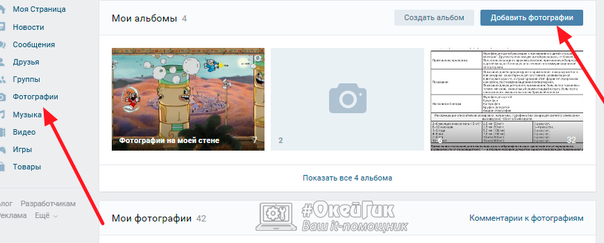 Если вам нужно загрузить фото в альбом, отличный от «Мои фотографии», вам нужно найти этот альбом на вашей личной странице и перейти в него. Найдите кнопку «Добавить фото» и повторите описанный выше процесс.