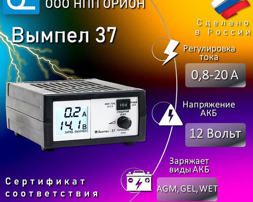 Зарядное устройство Orion Вимпел 37 идеально подходит для зарядки аккумуляторов сухих, wet-аккумуляторов и типов re. Оно имеет небольшой размер, что делает его удобным в использовании на выходных или в поездках.