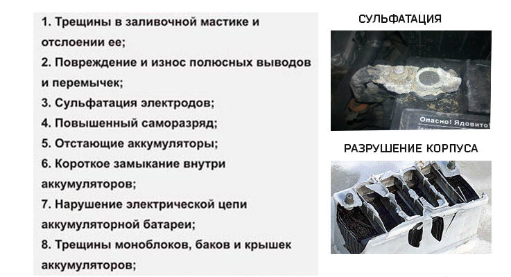 Если же аккумуляторная батарея имеет трещины в конструкции, в основном на поверхности пластин, то это говорит о том, что аккумулятор пострадал от короткого замыкания.