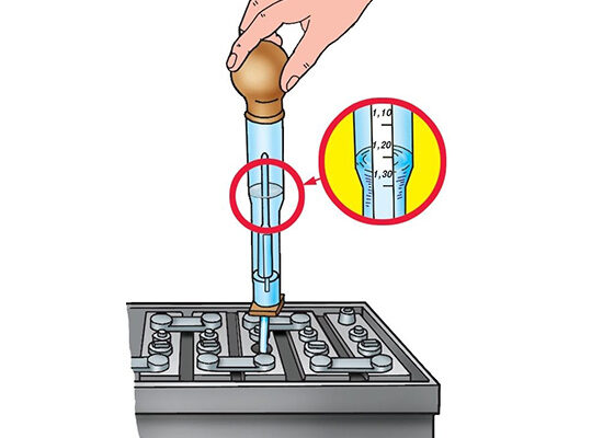 Важно отметить, что измерения плотности электролита следует производить при максимально заполненном аккумуляторе, поэтому перед измерением необходимо проверить уровень электролита в каждой из его банок.